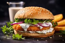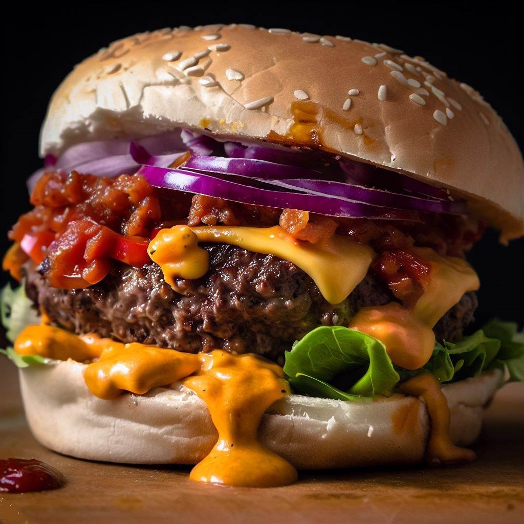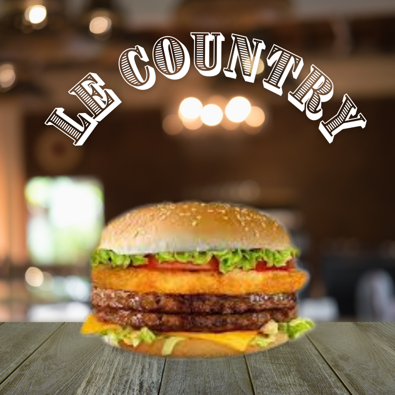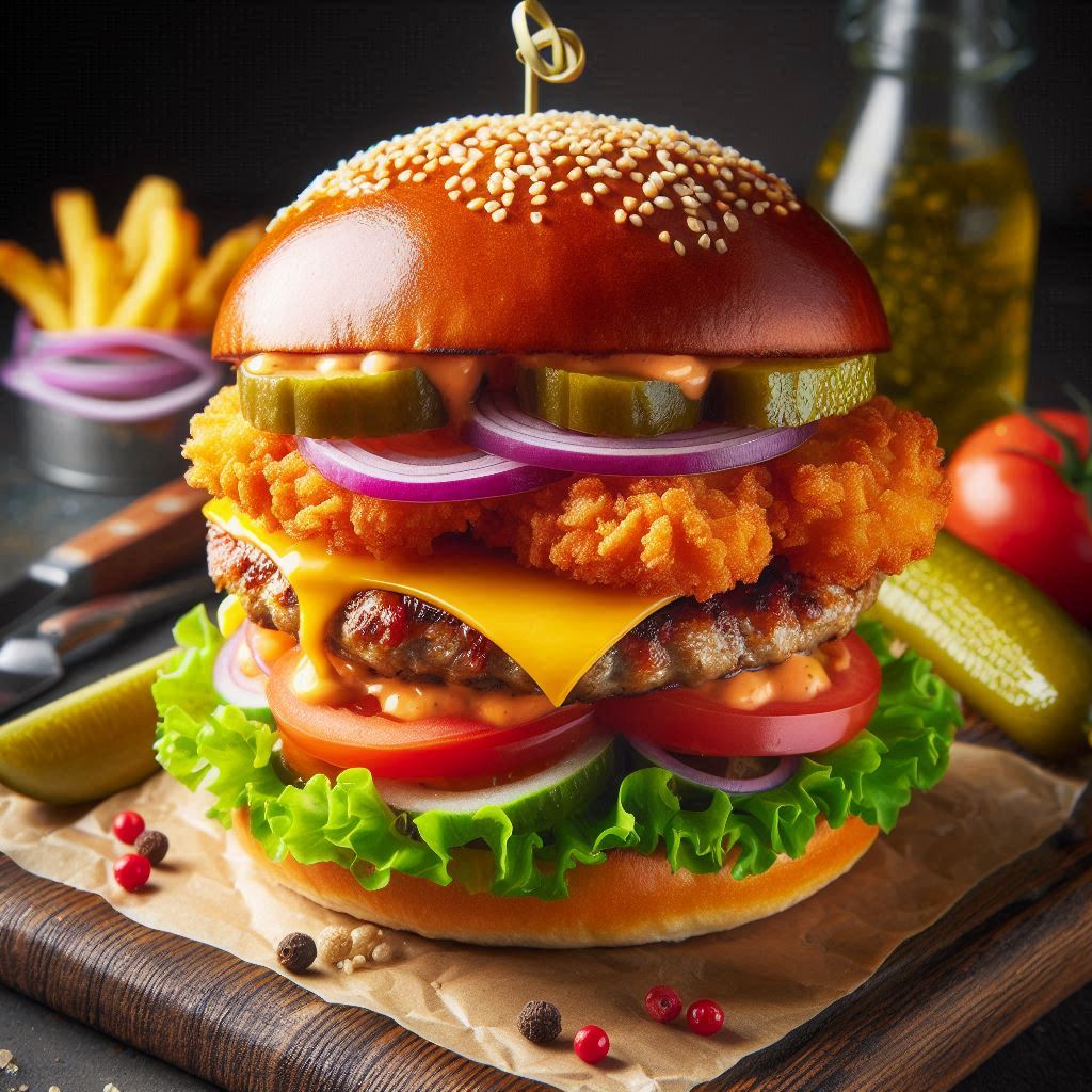 Pain brioché, viande hachée 150g, Poulet crousti, cheddar, salade, tomates, oignons rouges, cornichons, sauce