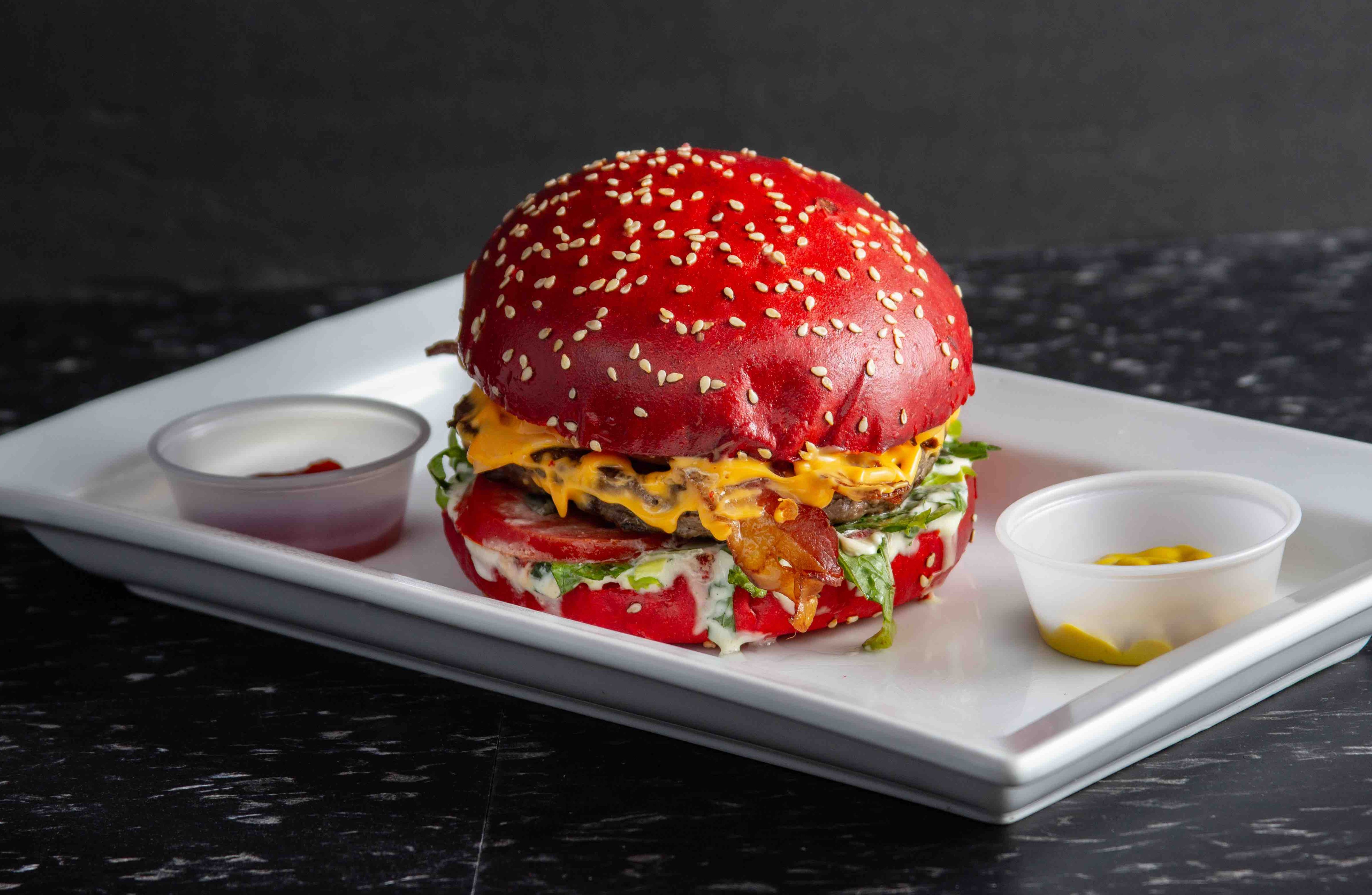 Pain brioché, viande hachée 150g, oeuf, raclette, salade, tomates, oignons rouges, cornichons