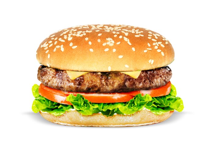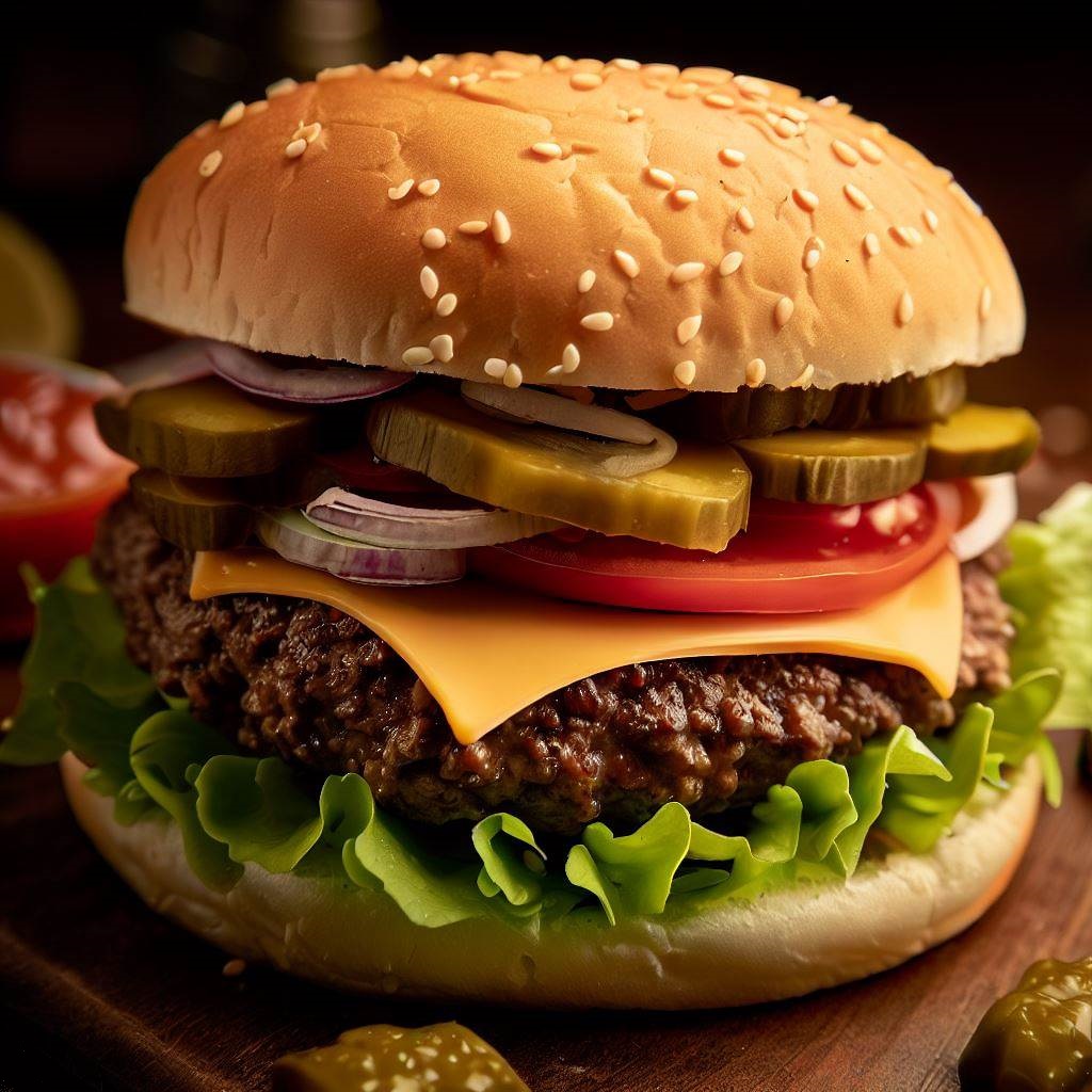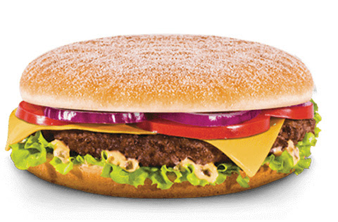Pain brioché, viande hachée 150g, cheddar, salade, tomates, oignons rouges, cornichons