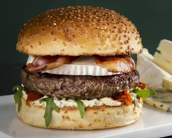 Pain brioché, viande hachée 150g, cheddar, salade, tomates, oignons rouges, chèvre, miel