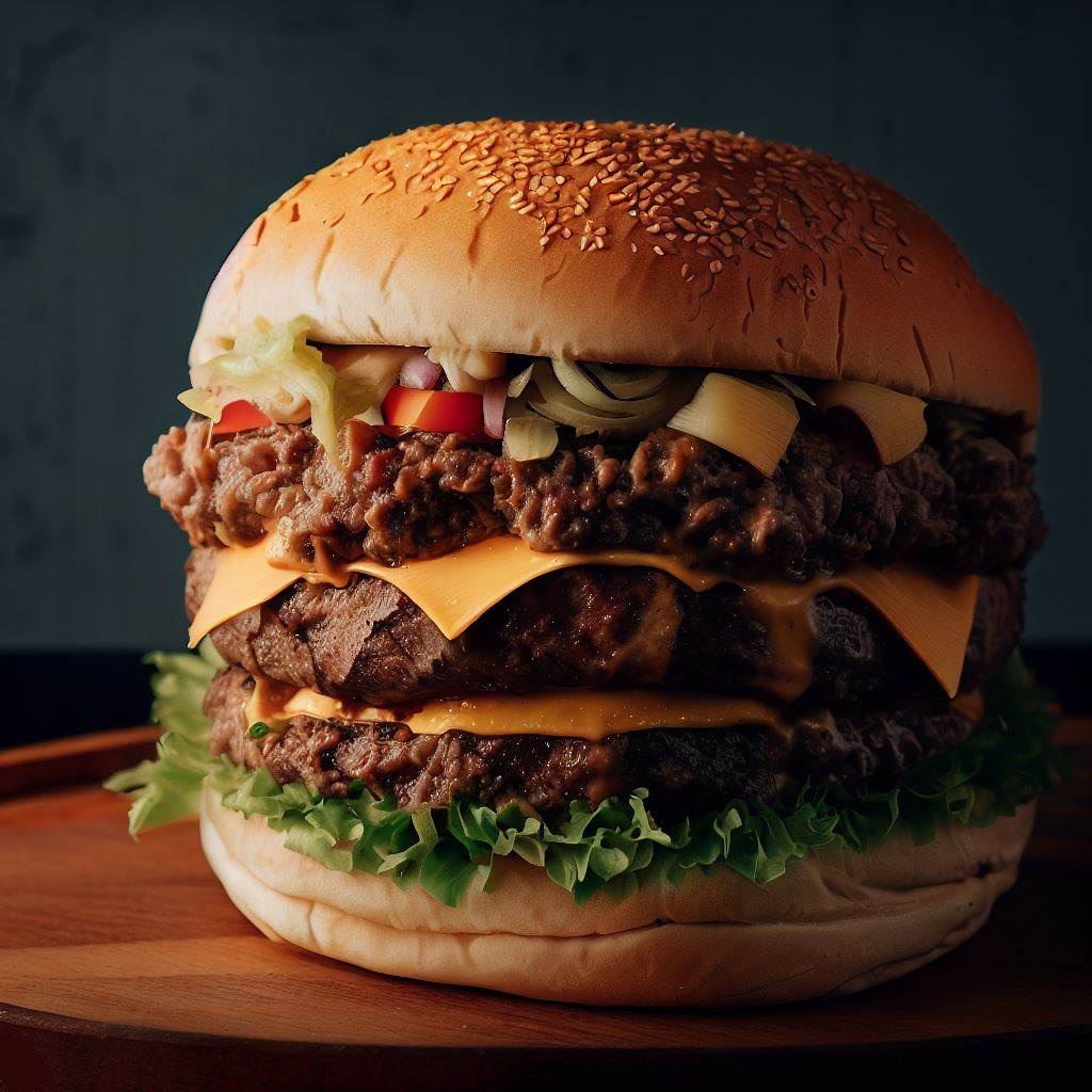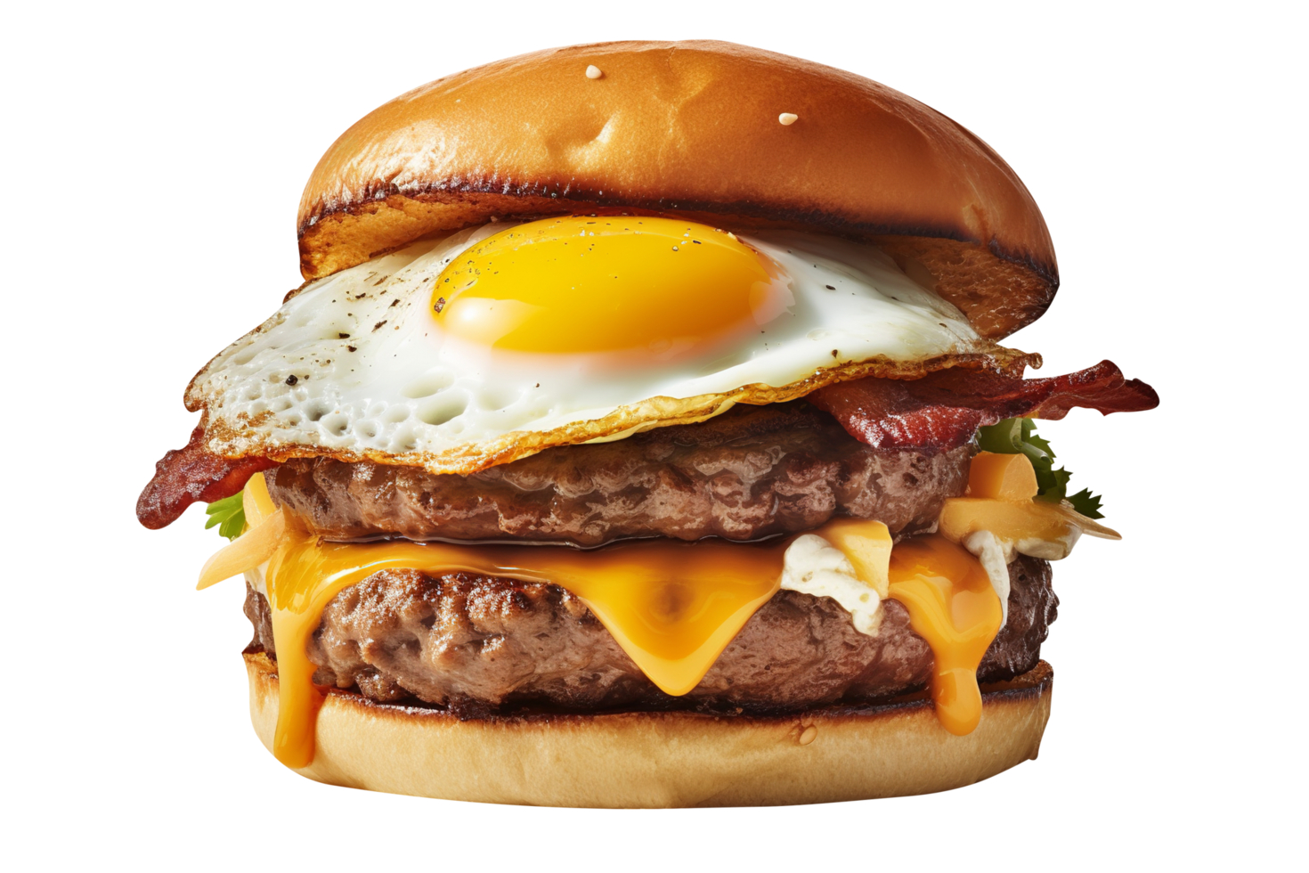 Pain brioché, 2x viande hachée 150g, oeuf, cheddar, salade, tomates, oignons rouges, cornichons