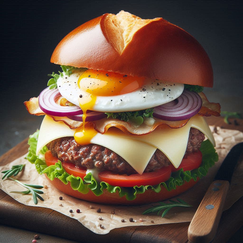 Pain brioché, viande hachée 150g, oeuf, bacon, cheddar, salade, tomates, oignons rouges, cornichons